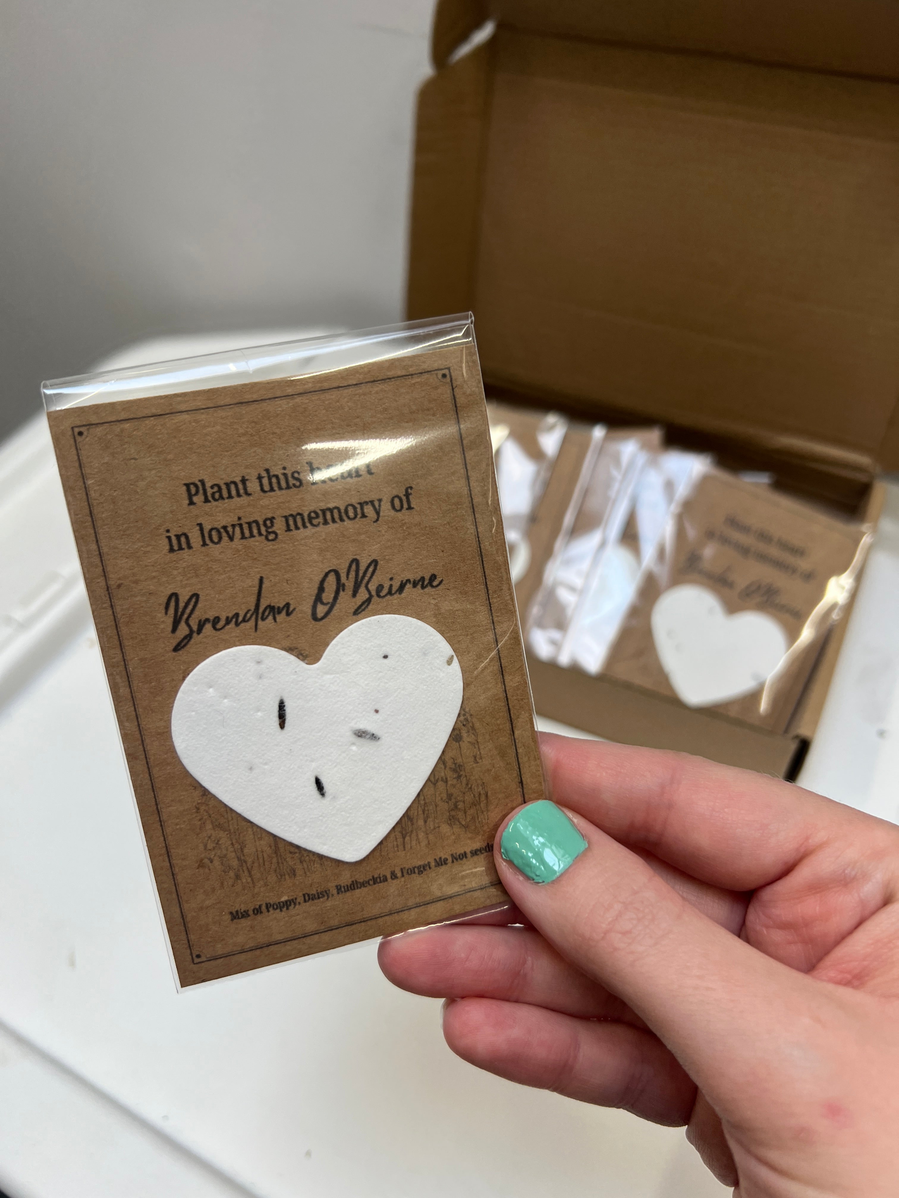 Each heart is lovingly created from recycled cotton paper, embedded with a mix of Poppy, Daisy, Rudbeckia and Forget Me Not seeds.